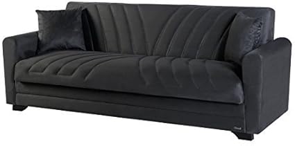 Divano letto a libro disponibile in vari rivestimenti in ecopelle o in tessuto in vari colori e caratterizzato dalla seduta e dallo schienale capitonnè.